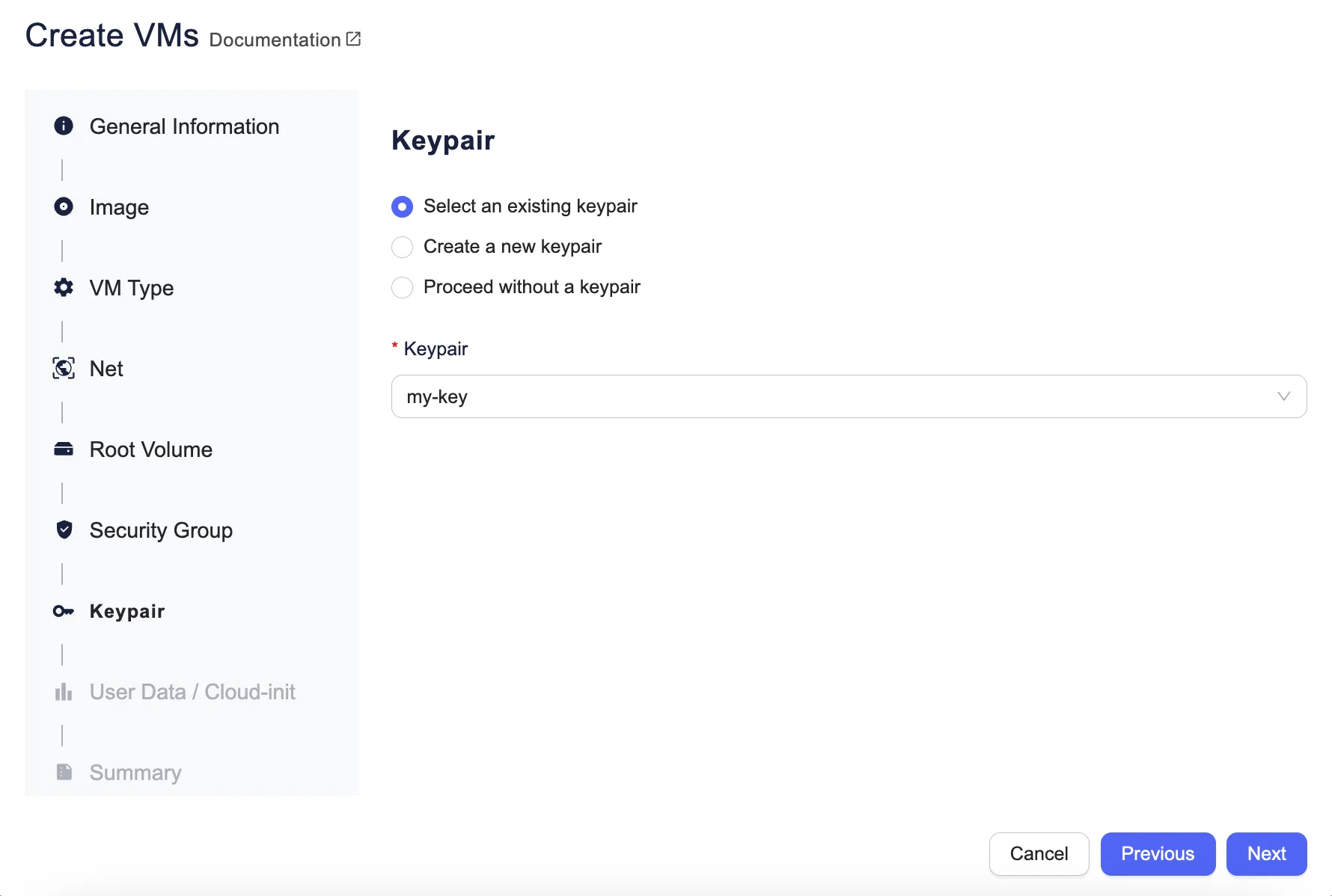 - Pour créer une paire de clés SSH, cliquez sur le bouton [Créer une Keypair] en haut de la fenêtre. +