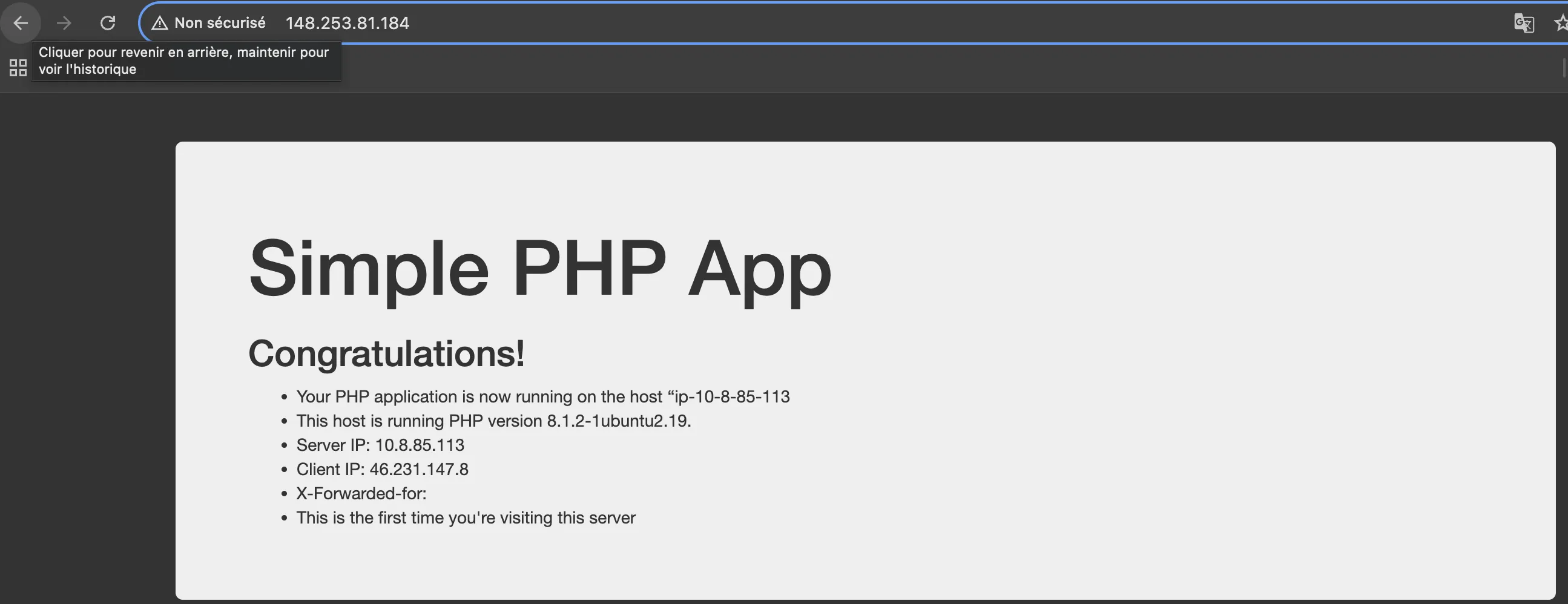 <ul><li>Your PHP application is now running on the host “<?php echo gethostname(); ?></li><li>This host is running PHP version <?php echo phpversion(); ?>.</li><li><?php echo "Server IP: ".$_SERVER['SERVER_ADDR']; ?></li><li><?php echo "Client IP: ".$_SERVER['REMOTE_ADDR']; ?></li><li><?php echo "X-Forwarded-for: ".$_SERVER['HTTP_X_FORWARDED_FOR']; ?></li>