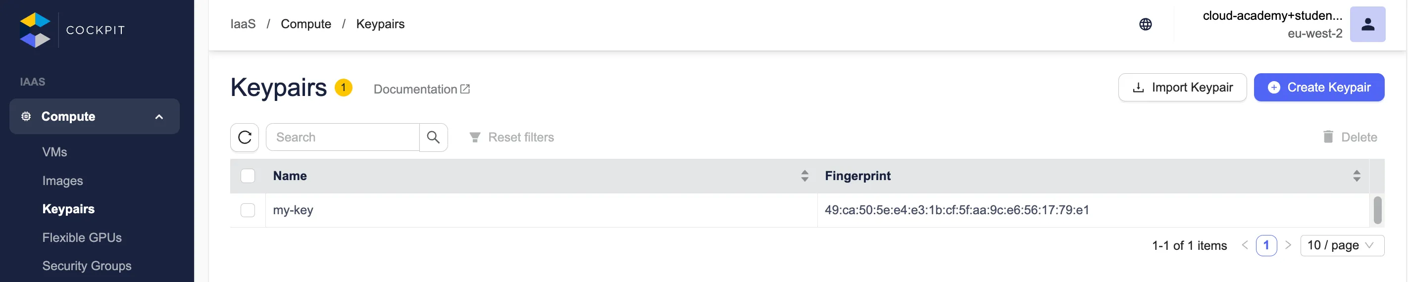 - Choisir Sécurité - Keypairs. Cela affichera une page pour gérer vos paires de clés SSH.