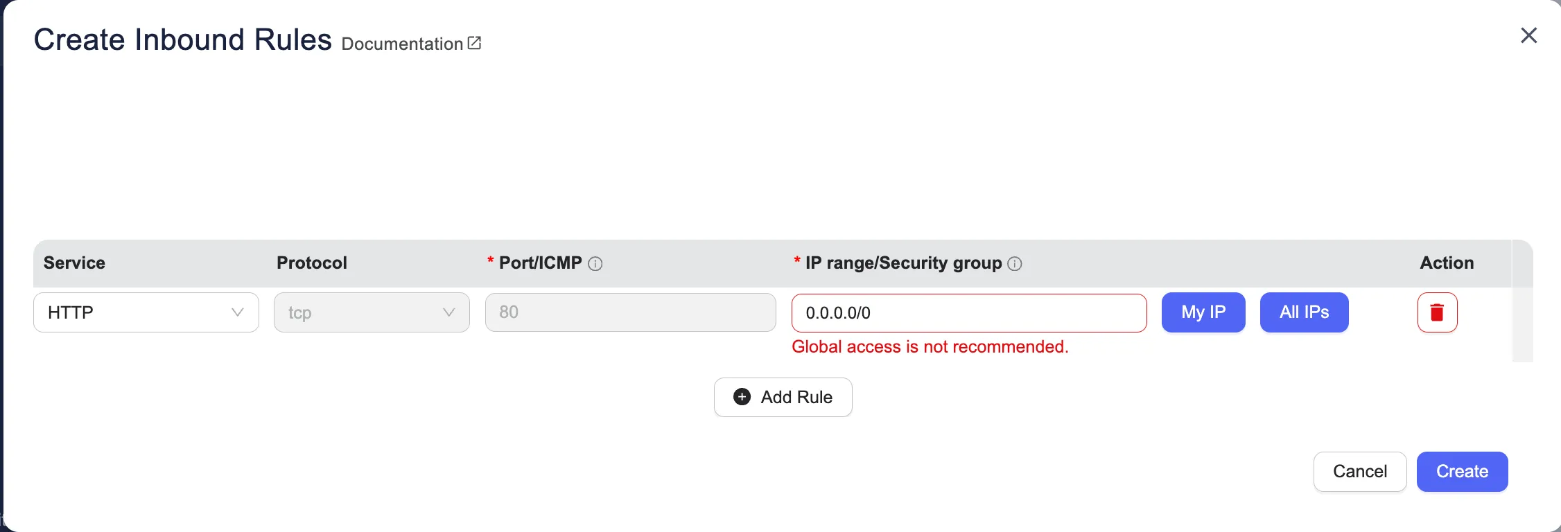 - Cliquez sur Créer des règles d’entrée. Les règles sont ajoutées au security group.