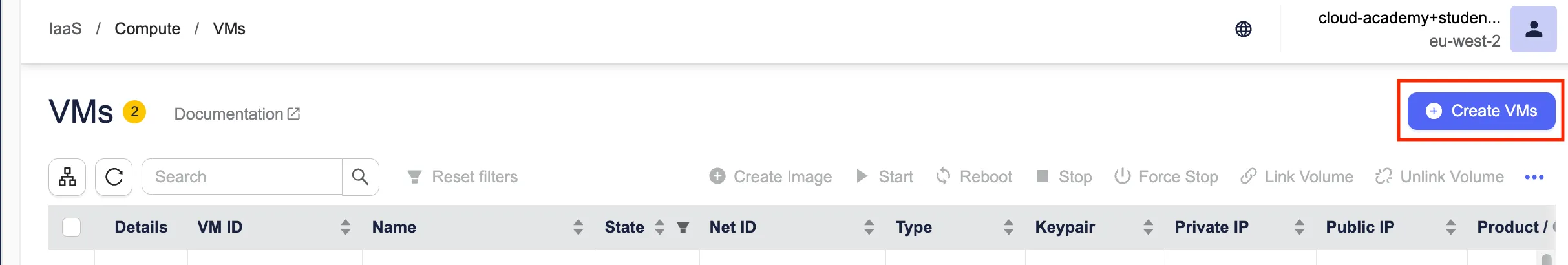 - Dans le dashboard VM, cliquez sur Créer des VMs.
