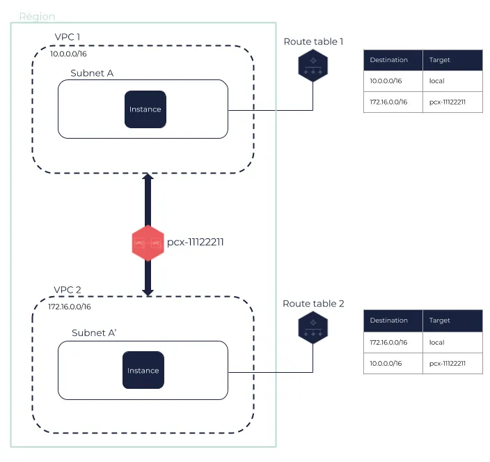 Section intitulée « Mise à jour les tables de routages »Pour autoriser le trafic entre des VPC pairs, vous devez mettre à jour les route tables associées à leurs subnets.