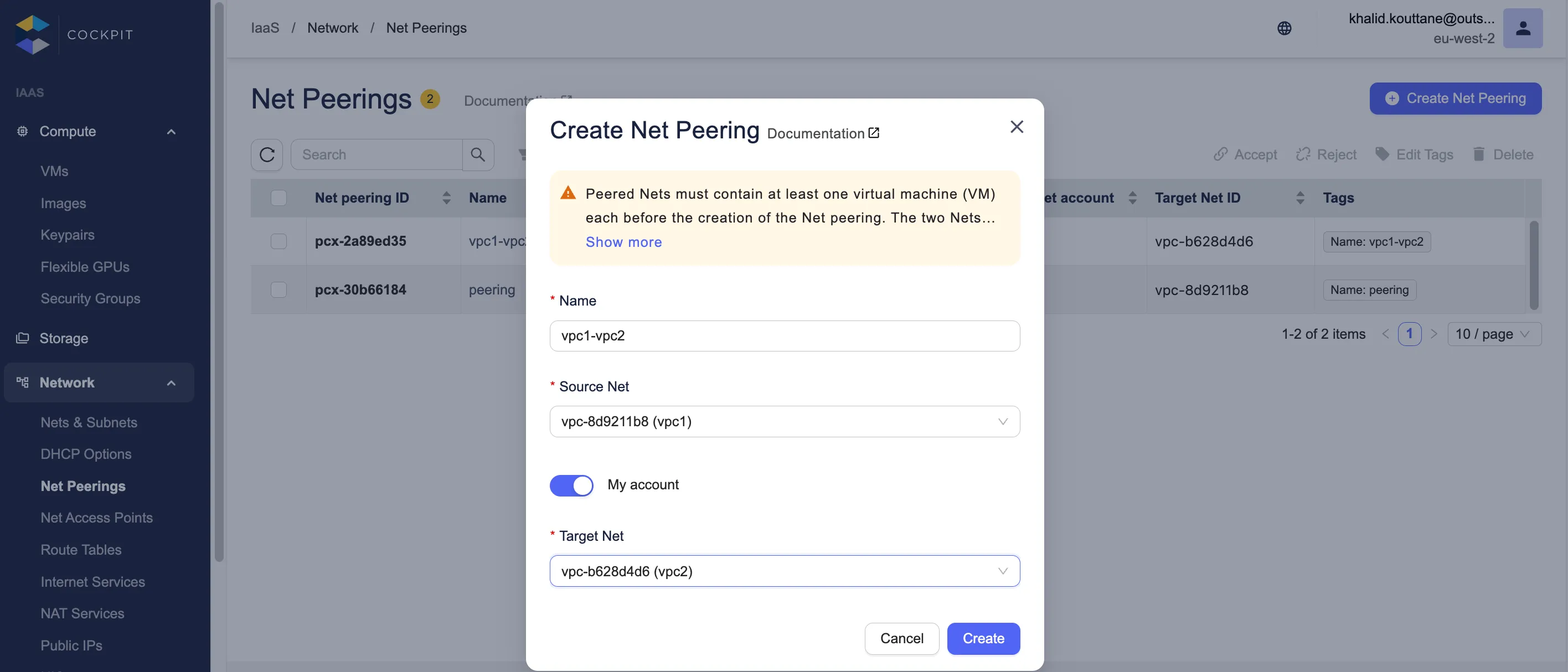 - Dans le dashboard Net Peerings, cliquez sur Créer un Net peering.
