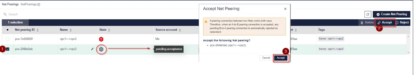 - Cliquez sur Accepter. Le Net peering est accepté.