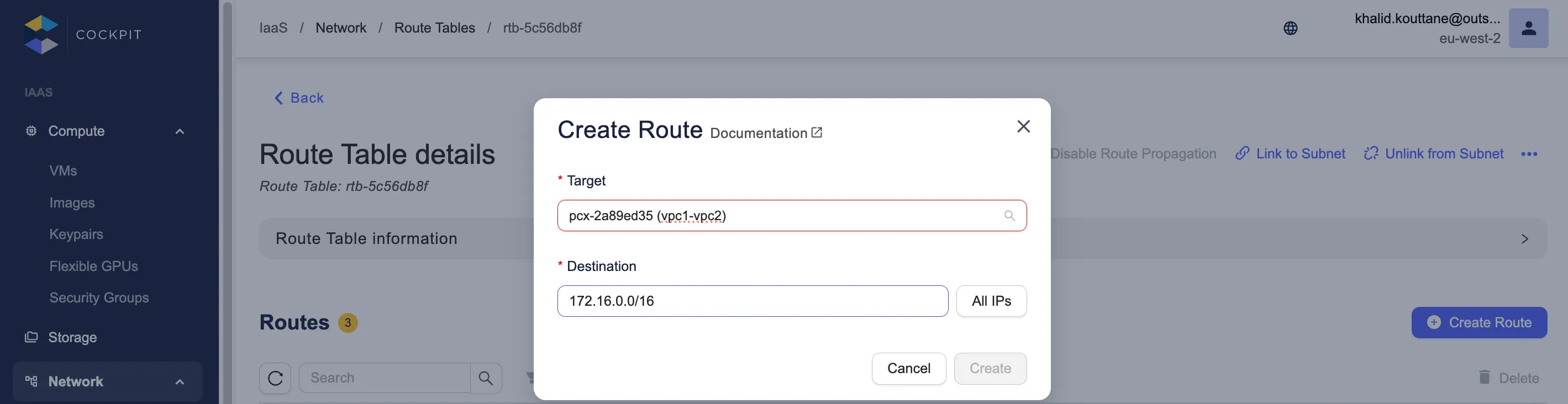 Chacun des propriétaires des VPC doit créer une nouvelle route avec le bloc CIDR de l’autre VPC en destination, et l’ID de la VPC peering connection en target. Cela permet aux instances de diriger le trafic entre les deux VPC.